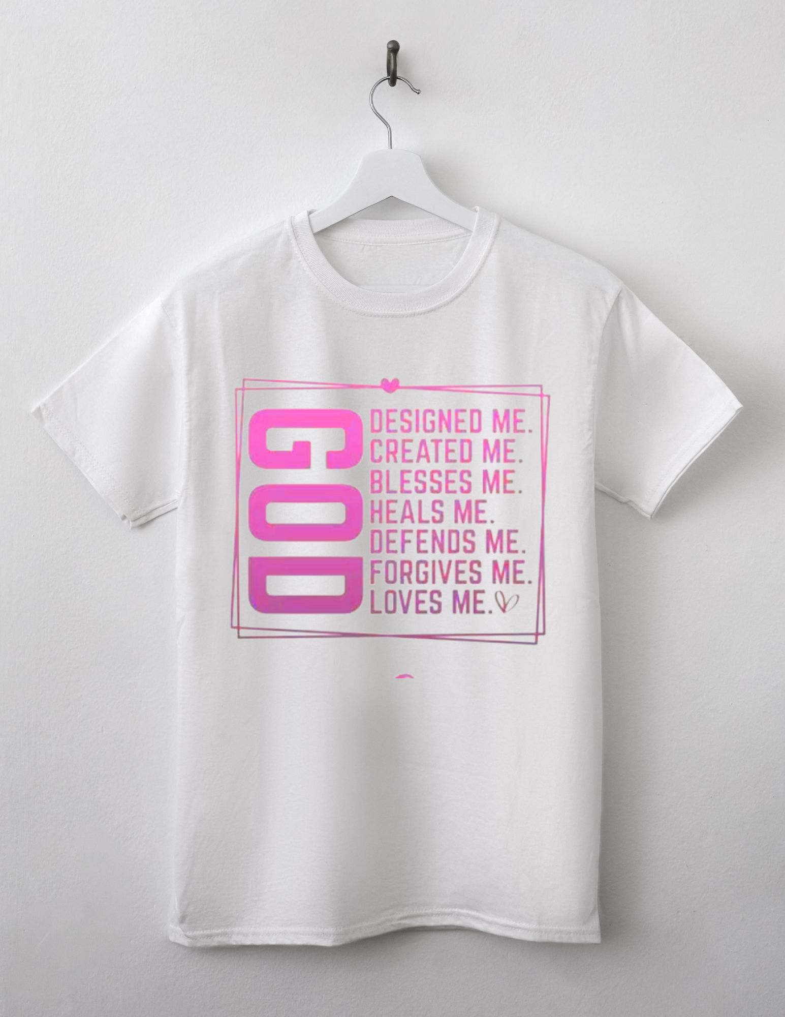 Celebrate your spiritual journey with this meaningful polyester t-shirt featuring an inspiring affirmation of faith. The design showcases five powerful declarations—God Designed Me, Created Me, Blesses Me, Forgives Me, Loves Me—serving as a daily reminder of divine purpose and unconditional grace. Crafted from comfortable, durable polyester fabric, this versatile piece works perfectly for casual wear, faith-based gatherings, or personal reflection. Whether you're strengthening your own beliefs or sharing your convictions with others, this t-shirt becomes a wearable testament to spiritual confidence and trust in a higher power.